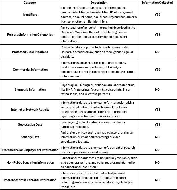 Categories of Personal Information: We collect information that identifies, relates to, describes, references, is reasonably capable of being associated with, or could reasonable be linked directly or indirectly with a particular consumer or device. The following is a list of categories of personal information as defined by the CCPA and the examples provided in the list below are those specifically defined in the CCPA.